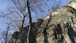 Chwila na popas. Stromo dość było. Zlazłyśmy ze szlaku, on wapienne ostańce omija. Po lewej stronie w dole tak równy kawał skalnej ściany, że przysięgłabym że to ludzki wyrób. Reszta jakiegoś kasztelu.