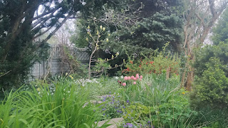 Cykanki tym razem trochę oszukane, wycinanki z większych. Ale uwaga, psiząbki 'Pagoda' się rozrastają, magnolia powolutku staje się drzewem, tulipany bez wykopywania kwitną trzeci rok, kamasje mają liczne pąki w dwóch zbitych kępach, podziabana na drobne cząstki (niechcący oczywiście) żółta szachownica cesarska kwitnie jednym kwiatem, ale zdaje się że każdy kawałek wypuścił zielone. Rozmnożyłam? A, i kradziony z Przeprośnej Górki bizantyjski barwinek (vinca major) zakwitł. To jest Rolls Royce wśród barwinków, mała kępeczka już jest z pojedyńczej odnóżki i jak na taką kępunię kwitnie wstrząsająco. Ciekawe czy miewa inne kolory.