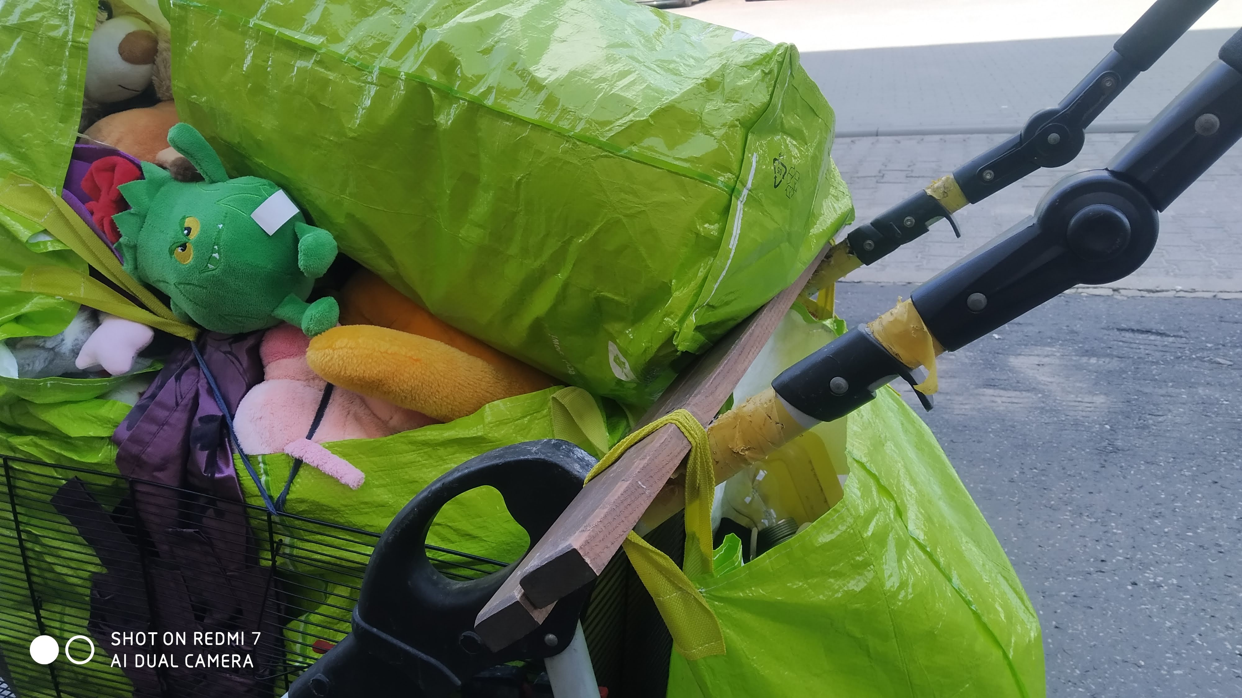 One pokazują załadowany torbiszczami środek transportu. Inny od dotychczasowego. Niby wszystko ok, ten stelaż wózka pozwala na odrobinę pewniejsze zamocowanie bagażu, kółka ma mocniejsze. Ale jednak dał popalić załadowany, nie zrobiłam próby z załadunkiem. Prowadzi się cholernie ciężko, coś tak jak poprzedni po zaspach, skręca przestrasznie, prawie wcale nie da się nim pokonać krawężników. Rzecz wymaga siły kulturysty, a przy krawężnikach to taki pierwszy z brzegu by popękał. Wózek pierwszy i ostatni raz użyty, on nie na moje siły. Ale nie tylko przez wózek odzipuję w głębokim cieniu, nie mogąc się pozbierać do dalszego pchania klunkra. Bo nie wiem jak u Ciebie Czytaczu, ale u mnie słońce znów pali, kałuże po nocnych ulewach są, ale na gorąc ulewy pomogły średnio. Co udowadnia gołąb moczący kuper nieopodal mnie. Też bym pomoczyła.